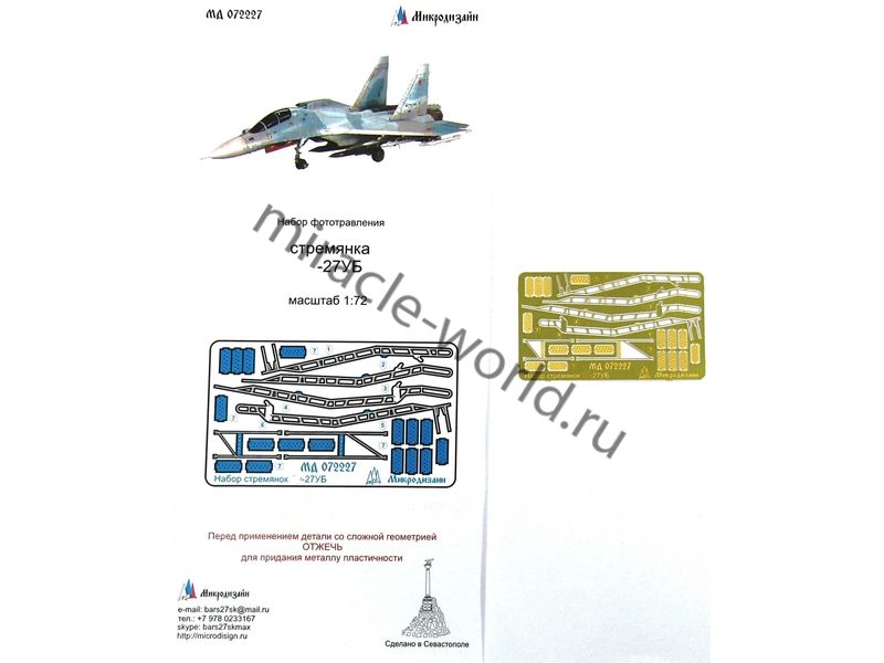 МД 072227 Набор фототравления стремянок на Су-27УБ. Масштаб 1:72. Материал: латунь 0,17 мм. Набор комплектуется пластиной фототравления и цветной инструкцией. Уровень сложности - средний.