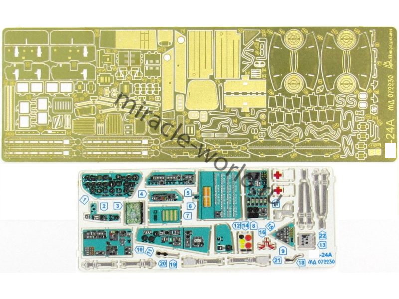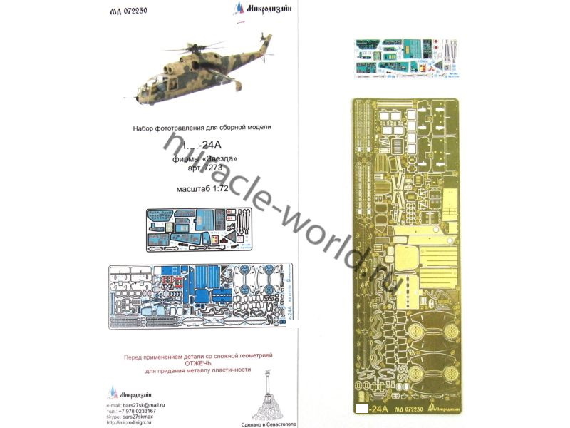 МД 072230 Набор фототравления вертолета М тип 24А от Звезды. Масштаб 1:72. Набор комплектуется 2 платами фототравления (в том числе 1 цветная плата интерьера кабины) к и цветной инструкцией. Количество уникальных деталей 86 шт. Уровень сложности - средний.