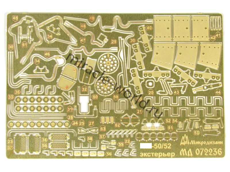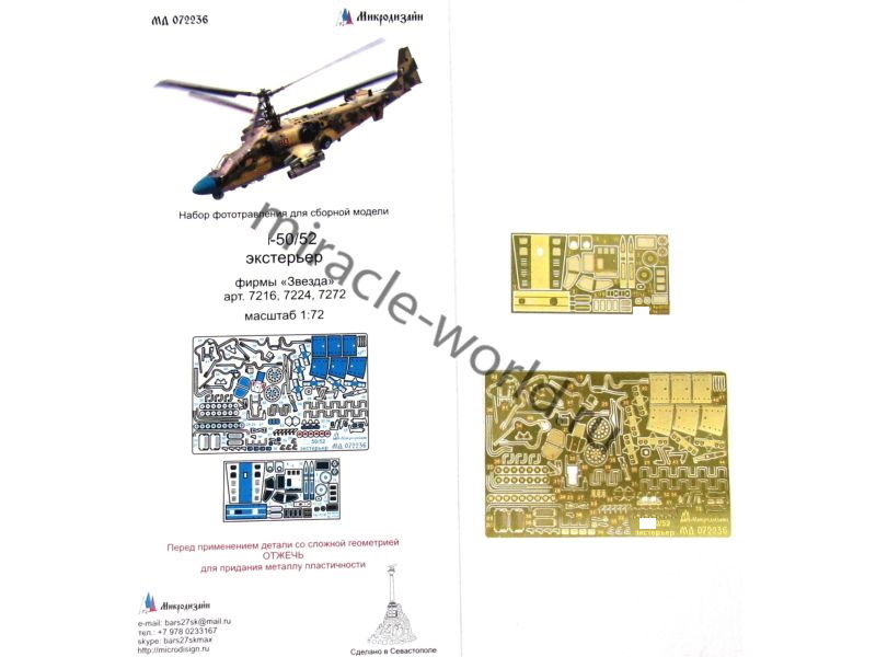 МД 072236 Набор фототравления деталей экстерьера на вертолет К тип 50/52 от Звезды. Масштаб 1:72. Материал: латунь 0,17 мм, 0,13 мм. Набор комплектуется 2 пластинами фототравления и цветной инструкцией. Количество уникальных деталей 63 шт. Уровень сложности - средний.