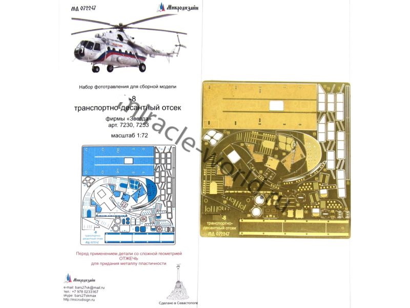 МД 072247 Набор фототравления вертолета М тип 8 (транспортно-десантный отсек) от Звезды. Масштаб 1:72. Набор комплектуется платой фототравления и цветной инструкцией. Количество уникальных деталей 49 шт. Уровень сложности - средний.