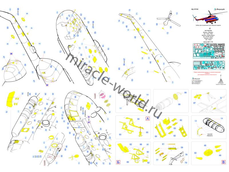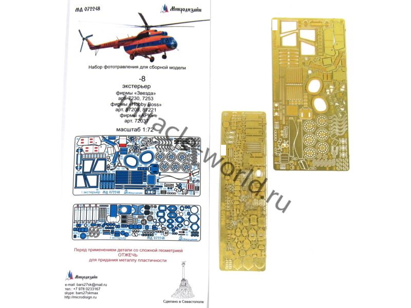 МД 072248 Набор фототравления вертолета М тип 8 (экстерьер) от Звезды. Масштаб 1:72. Материал: латунь 0,17 и 0,15 мм. Набор комплектуется 2 платами фототравления и цветной инструкцией. Количество уникальных деталей 129 шт. Уровень сложности - средний.