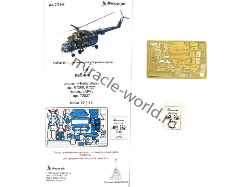 МД 072249 Набор фототравления вертолета М тип 8 (кабина) от Hobby Boss и АРК. Масштаб 1:72. Набор комплектуется платой фототравления, пленкой приборных досок и цветной инструкцией. Количество уникальных деталей 28 шт. Уровень сложности - средний.