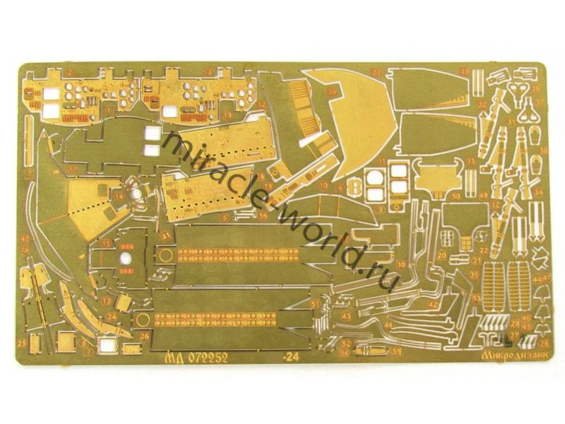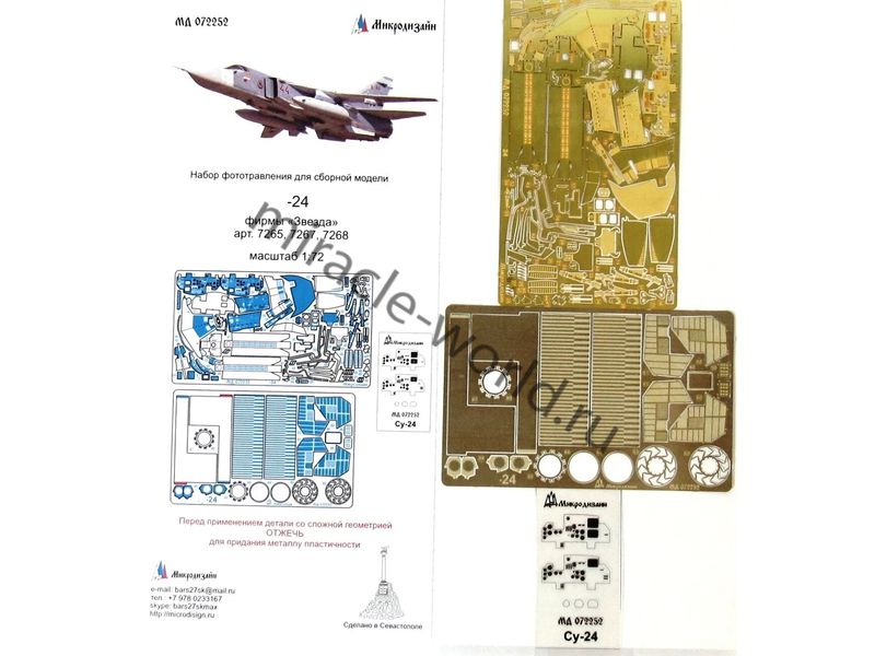 МД 072252 Набор фототравления на Су-24 /М/МР от Звезды. Масштаб 1:72. Материал: латунь 0,17 мм, мельхиор 0,12 мм. Набор комплектуется 2 пластинами фототравления, пленкой приборных досок и цветной инструкцией. Количество уникальных деталей - 68. Уровень сложности - средний.