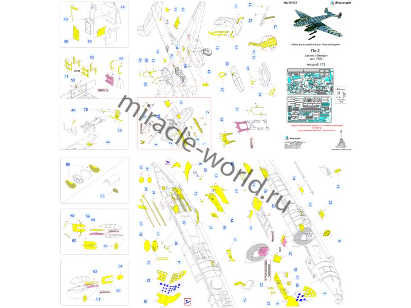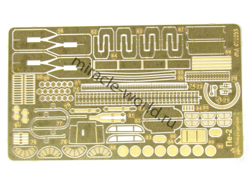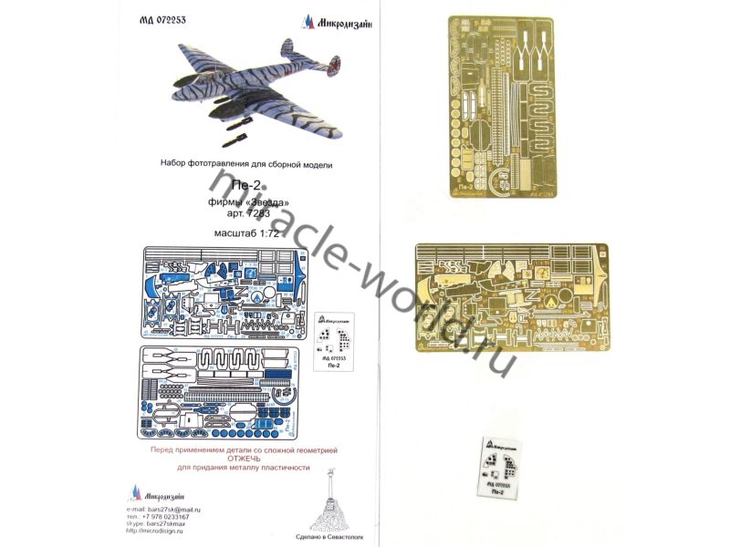 МД 072253 Набор фототравления для модели Пе-2 от Звезды. Масштаб 1:72. Материал: латунь 0,17 мм, 0,14 мм. Набор комплектуется 2 пластинами фототравления, пленкой приборных досок и цветной инструкцией. Количество уникальных деталей - 79. Уровень сложности - средний.