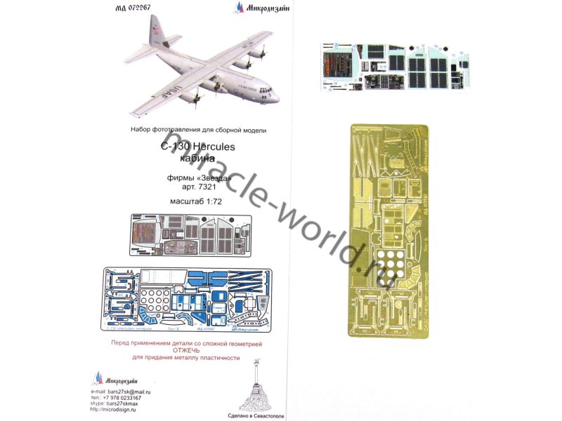МД 072267 Набор фототравления для C-130 Hercules (пилотская кабина) от Звезды. Масштаб 1:72. Материал: латунь 0,15 мм. Набор комплектуется 2 пластинами фототравления (она пластина с цветными приборными досками) и цветной инструкцией. Количество уникальных деталей - 44. Уровень сложности - средний.