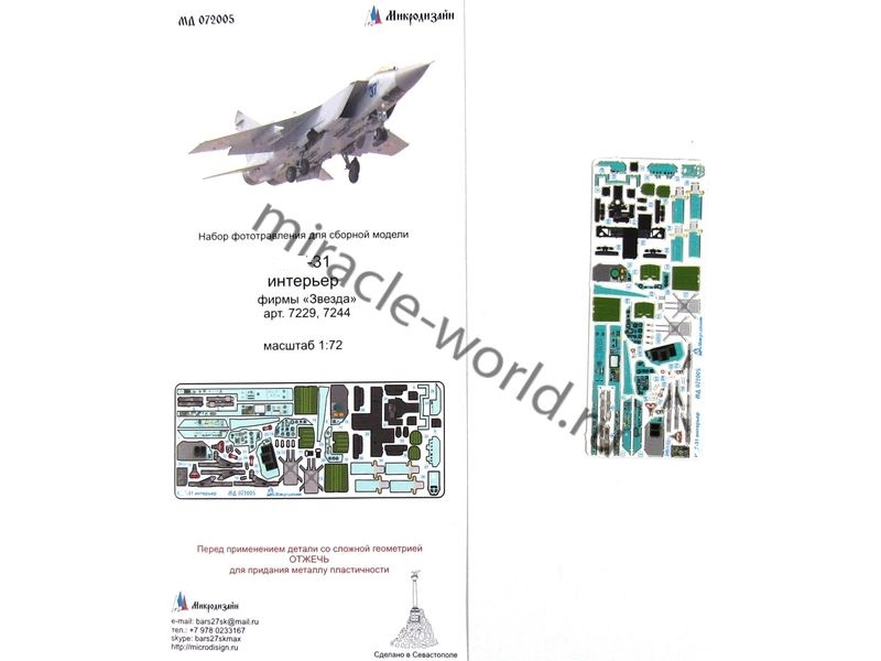 МД 072005 Набор фототравления для модели МиГ-31 (интерьер) от Звезды. Масштаб 1:72. Материал: латунь 0,15 мм. Набор комплектуется цветной пластиной фототравления и цветной инструкцией. Количество уникальных деталей - 36. Уровень сложности - средний.