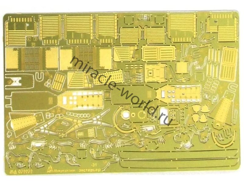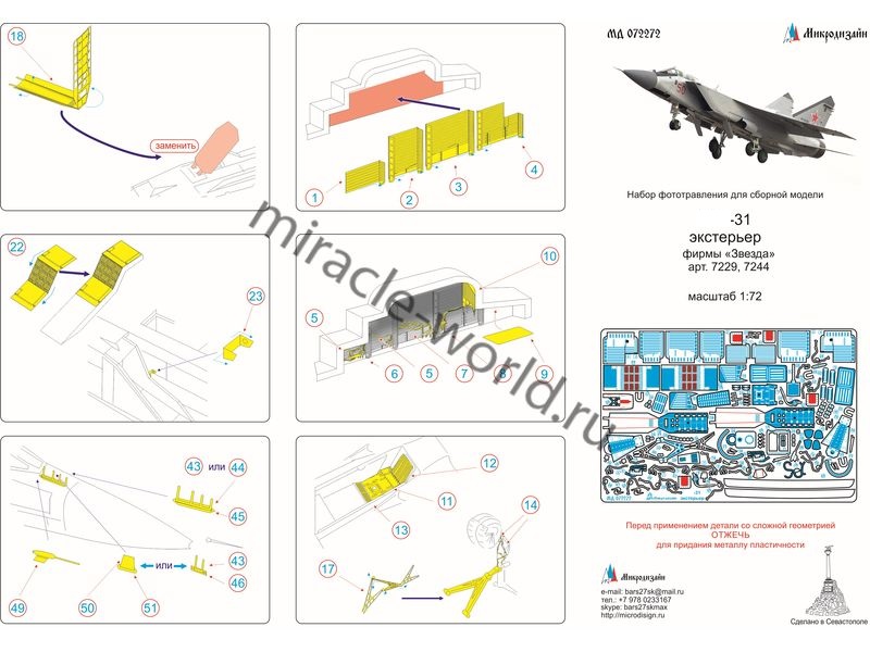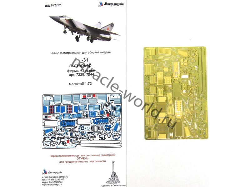МД 072272 Набор фототравления для модели МиГ-31 (экстерьер) от Звезды. Масштаб 1:72. Материал: латунь 0,15 мм. Набор комплектуется пластиной фототравления и цветной инструкцией. Количество уникальных деталей - 58. Уровень сложности - средний.