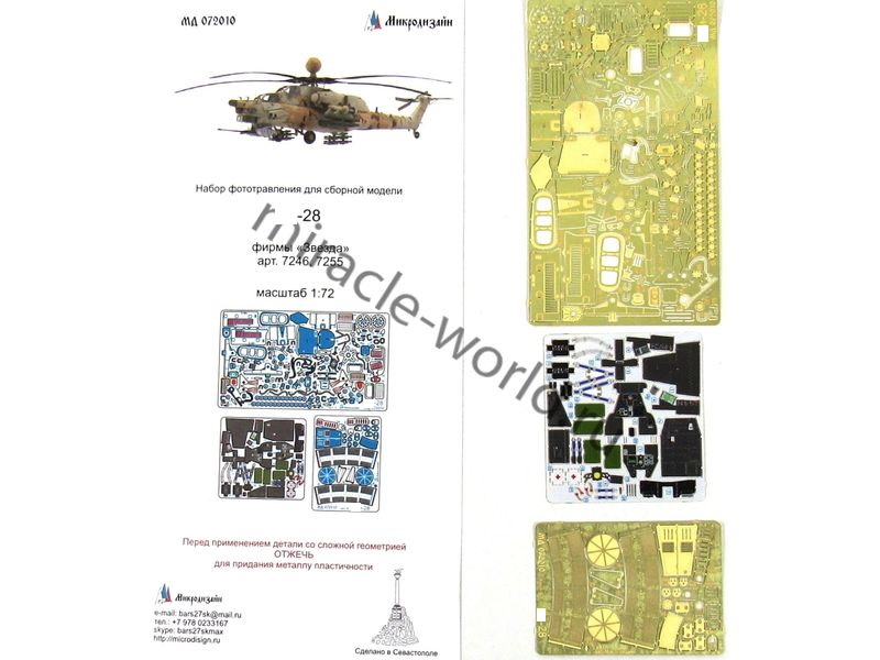 МД 072010 Набор цветного фототравления на вертолет М тип 28 от Звезды. Масштаб 1:72. Набор комплектуется 3 платами фототравления (цветные приборные доски) и цветной инструкцией. Количество уникальных деталей 106 шт. Уровень сложности - средний.