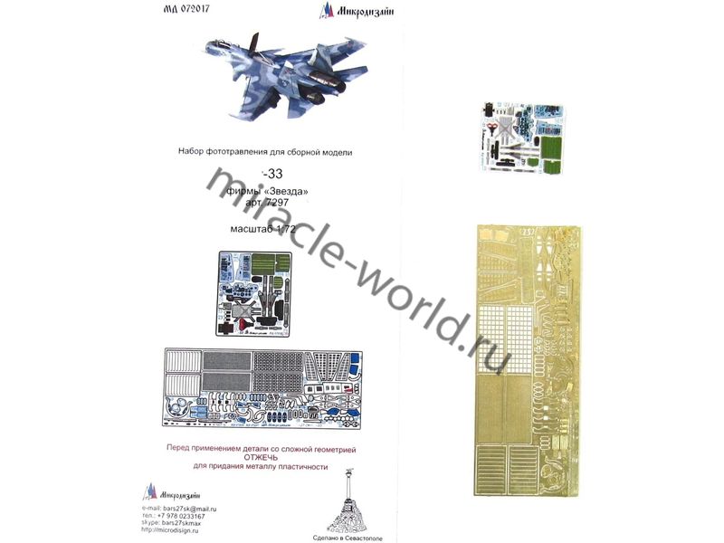 МД 072017 Набор цветного фототравления на Су-33 от Звезды. Масштаб 1:72. Набор комплектуется 2 платами фототравления (цветные приборные доски) и цветной инструкцией. Количество уникальных деталей 97 шт. Уровень сложности - средний.