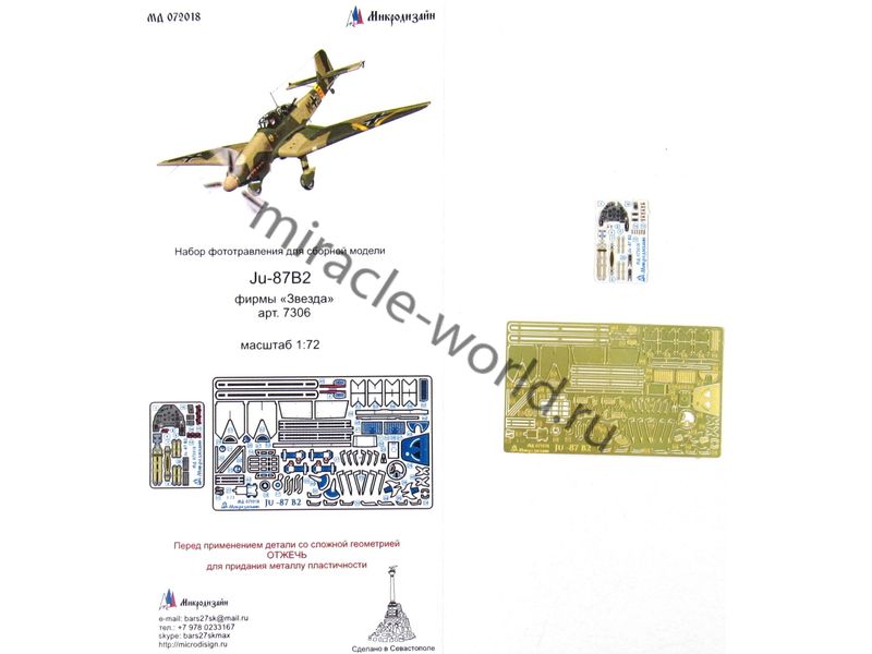 МД 072018 Набор цветного фототравления на Ju-87B2 от Звезды. Масштаб 1:72. Набор комплектуется 2 платами фототравления (цветные приборные доски) и цветной инструкцией. Количество уникальных деталей 57 шт. Уровень сложности - средний.