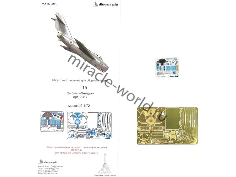 МД 072020 Набор цветного фототравления на МиГ-15 от Звезды. Масштаб 1:72. Набор комплектуется 2 платами фототравления (цветные приборные доски) и цветной инструкцией. Количество уникальных деталей 37 шт. Уровень сложности - начальный.
