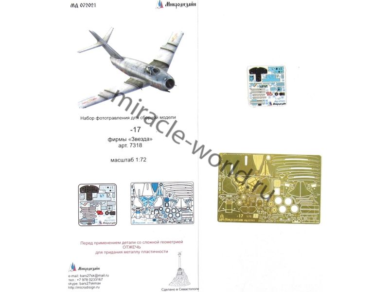 МД 072021 Набор цветного фототравления на МиГ-17 от Звезды. Масштаб 1:72. Набор комплектуется 2 платами фототравления (цветные приборные доски) и цветной инструкцией. Количество уникальных деталей 41 шт. Уровень сложности - начальный.