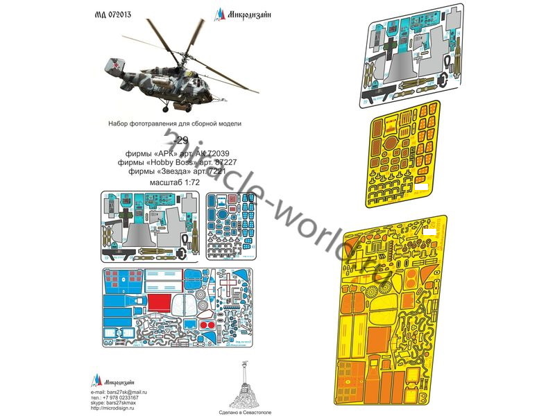 МД 072013 Набор цветного фототравления на вертолет К тип 29 от (АРК,Звезды, Hobby Boss). Масштаб 1:72. Набор комплектуется 3 платами фототравления (цветные приборные доски) и цветной инструкцией. Количество уникальных деталей 112 шт. Уровень сложности - средний.