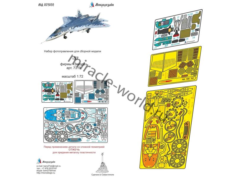 МД 072032 Набор цветного фототравления кабины Су-57 от Звезды. Масштаб 1:72. Набор комплектуется 3 платами фототравления (цветные приборные доски) и цветной инструкцией. Количество уникальных деталей 71 шт. Уровень сложности - средний.