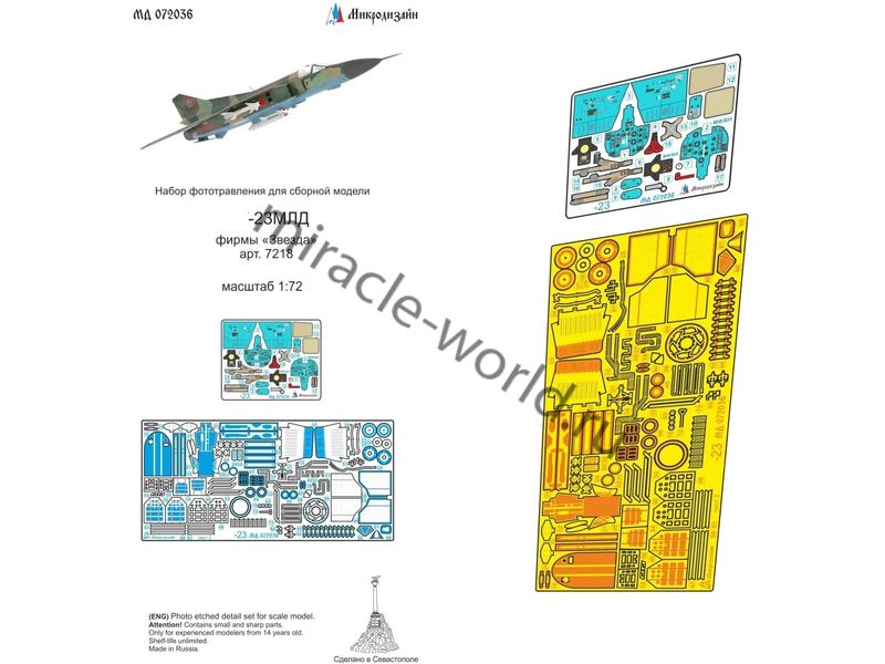 МД 072036 Набор цветного фототравления кабины МиГ-23МЛД от Звезды. Масштаб 1:72. Набор комплектуется 2 платами фототравления (цветные приборные доски) и цветной инструкцией. Количество уникальных деталей 54 шт. Уровень сложности - средний.
