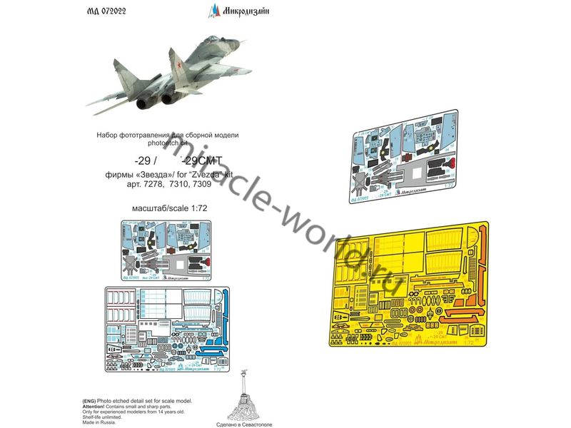 МД 072022 Набор цветного фототравления кабины МиГ-29/МиГ-29СМТ от Звезды. Масштаб 1:72. Набор комплектуется 2 платами фототравления (цветные приборные доски) и цветной инструкцией. Количество уникальных деталей 67 шт. Уровень сложности - средний.