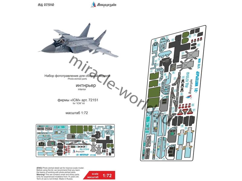 МД 072040 Набор цветного фототравления кабины МиГ-31 от ICM. Масштаб 1:72. Набор комплектуется платой фототравления цветных объемных приборных досок и цветной инструкцией. Количество уникальных деталей 36 шт. Уровень сложности - средний.