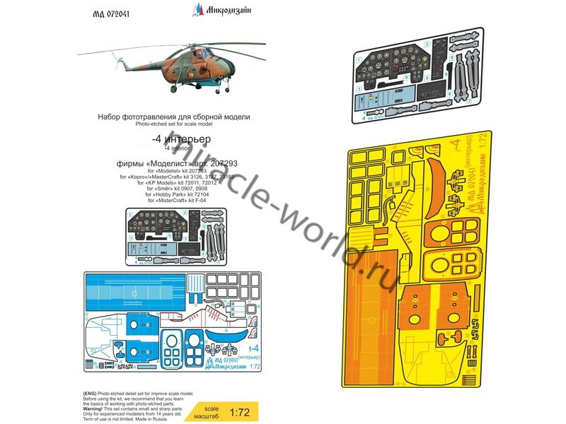 МД 072041 Набор цветного фототравления интерьера на вертолет М тип 4 от (Моделист, КР, Smer). Масштаб 1:72. Набор комплектуется 2 платами фототравления (цветные приборные доски, панели, ремни) и цветной инструкцией. Количество уникальных деталей 29 шт. Уровень сложности - средний.