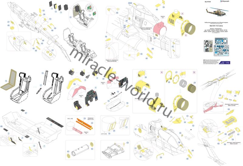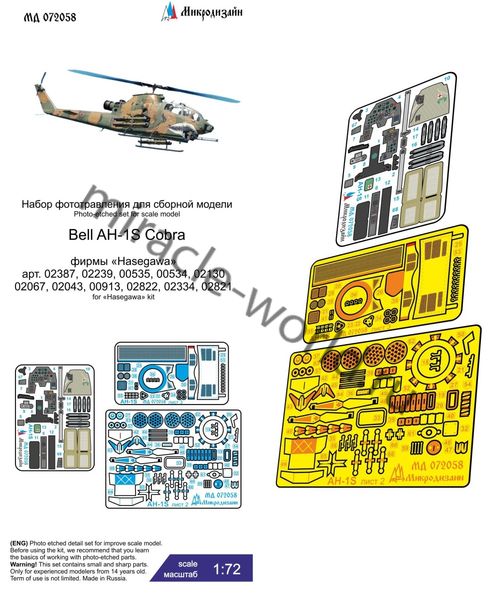 Микродизайн 072058 Набор фототравления на AH-1S Cobra от Hasegawa. Масштаб 1:72. Набор комплектуется 3 платами фототравления (в том числе цвтной платой интерьера кабины) и цветной инструкцией. Количество уникальных деталей 69 шт. Уровень сложности - средний.