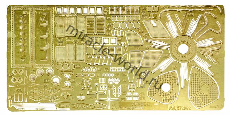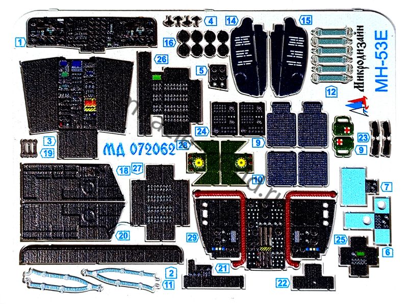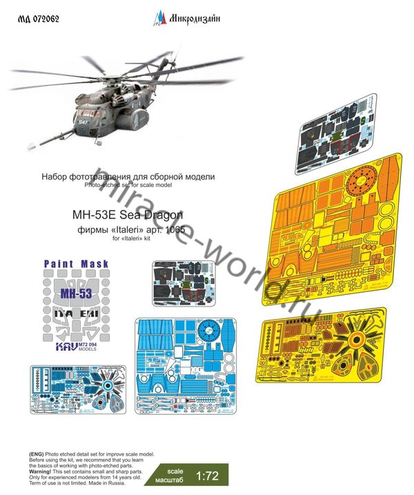 Микродизайн 072062 Набор цветного фототравления на MH-53E от Italeri. Масштаб 1:72. Набор комплектуется 3 платами фототравления (цветные приборные доски), окрасочными масками KAV models и цветной инструкцией. Количество уникальных деталей: 135 шт. Уровень сложности - высокий.