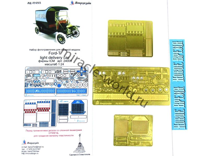 МД 024203 Набор фототравления для модели Ford-T развозной фургон от ICM (арт.24008). Набор комплектуется тремя платами фототравления, декалью "Новое время", прозрачной пленкой для фонарей и цветной инструкцией. Уровень сложности: средний
