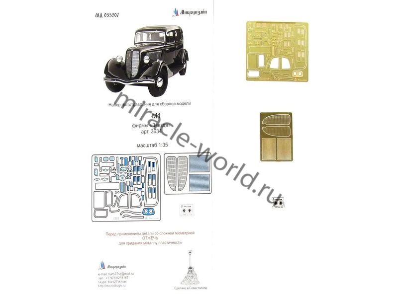 МД 035207 Фототравление для сборной модели фирмы "Звезда" ГАЗ-М1. Масштаб 1:35. Материал: латунь 0,17 мм и мельхиор 0,15 мм. Набор состоит из 2 пластин фототравления, 1 пленки (приборная доска) и полноцветной инструкции. Уровень сложности - простой.