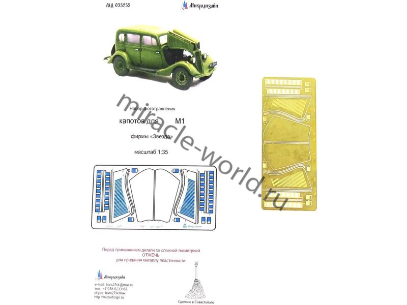 МД 035255 Фототравление капотов на ГАЗ-М1 от Звезды. Масштаб 1:35. Материал: латунь 0,17 мм. Набор комплектуется платой фототравления и цветной инструкцией. Количество уникальных деталей 7 шт. Уровень сложности - средний.