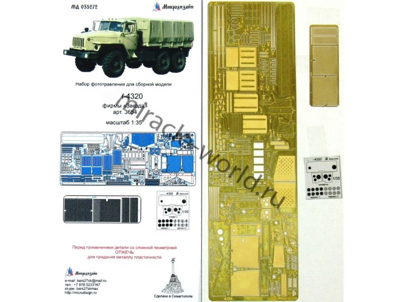 МД 035272 Набор фототравления на модель Урал-4320 от Звезды. Масштаб 1:35. Набор комплектуется платой фототравления, пленкой (приборная доска, катафоты) и цветной инструкцией. Количество уникальных деталей: 87 шт. Уровень сложности - средний.