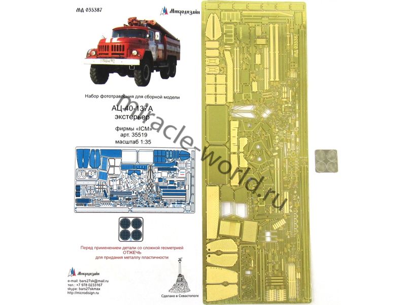 МД 035387 Набор фототравления на АЦ-40 (экстерьер) от ICM. Масштаб 1:35. Набор комплектуется 2 платами фототравления и цветной инструкцией. Количество уникальных деталей: 159 шт. Уровень сложности - высокий.