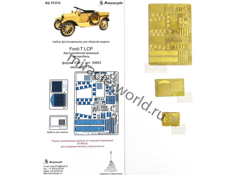 МД 035245 Набор фототравления для модели Ford-T LCP от ICM. Масштаб 1:35. Материал: латунь 0,17 мм, 0,3 мм. Набор комплектуется тремя платами фототравления и цветной полноцветной инструкцией