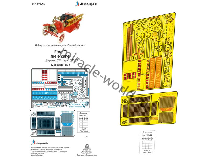 МД 035417 Набор фототравления на Ford T Fire Truck от ICM. Масштаб 1:35. Материал: латунь 0,15 мм. Набор комплектуется 2 платами фототравления, пленкой (фонари, шкалы манометров) и цветной инструкцией. Количество уникальных деталей: 75 шт. Уровень сложности - средний.
