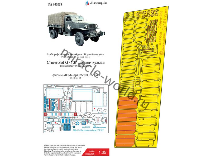 МД 035433 Набор фототравления деталировки кузова на Chevrolet G7107 от ICM. Масштаб 1:35. Материал: латунь 0,15 мм. Набор комплектуется платой фототравленияи цветной инструкцией. Количество уникальных деталей: 23 шт. Уровень сложности - средний.