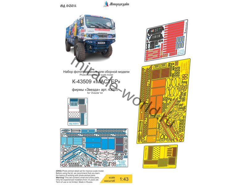 МД 043014 Набор фототравления на К-43509 "Мастер" от Звезды. Масштаб 1:43. Материал: латунь 0,15 мм. Набор комплектуется 3 платами фототравления (в том числе цветная плата приборных досок) и цветной инструкцией. Количество уникальных деталей: 70 шт. Уровень сложности - средний.