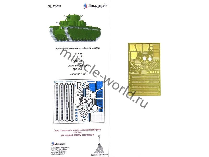 МД 035220 Набор фототравления сеток для сборной модели Т-35 от Звезды (арт.3667). Масштаб 1:35. Материал: латунь 0,17 мм. Набор комплектуется пластиной фототравлени и полноцветной инструкцией. уровень сложности - начальный.