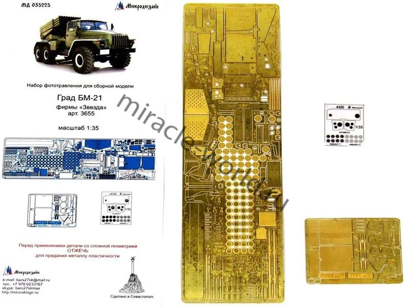 МД 035225 Набор фототравления на модель Град БМ-21 от Звезды. Масштаб 1:35. Набор комплектуется 2 платами фототравления, пленкой (приборная доска, катафоты) и цветной инструкцией. Количество уникальных деталей: 87 шт. Уровень сложности - средний.