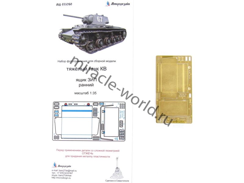 МД 035260 Фототравление ящика ЗИП (ранний) для танка КВ. Масштаб 1:35. Материал: латунь 0,17 мм. Набор комплектуется платой фототравления и цветной инструкцией. Уровень сложности - средний.