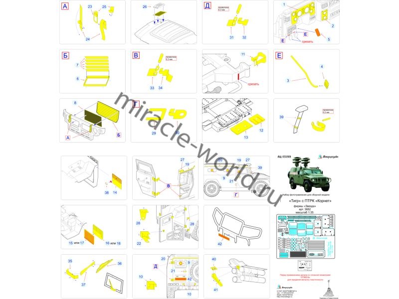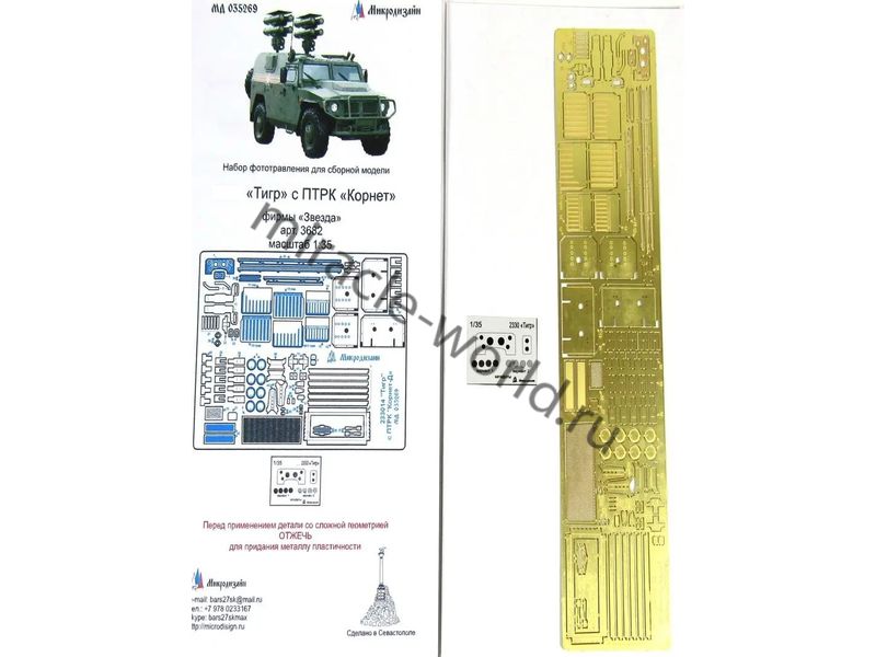 МД 035269 Набор фототравления для модели ГАЗ-Тигр с ПТРК "Корнет" от Звезды. Набор комплектуется платой фототравления, пленкой с приборами и цветной инструкцией. Количество уникальных деталей: 41 шт. Уровень сложности - начальный.