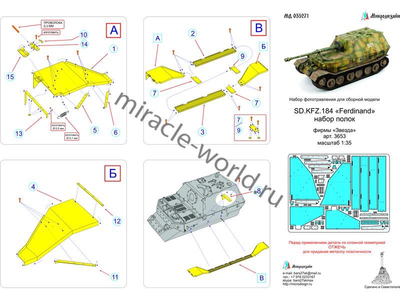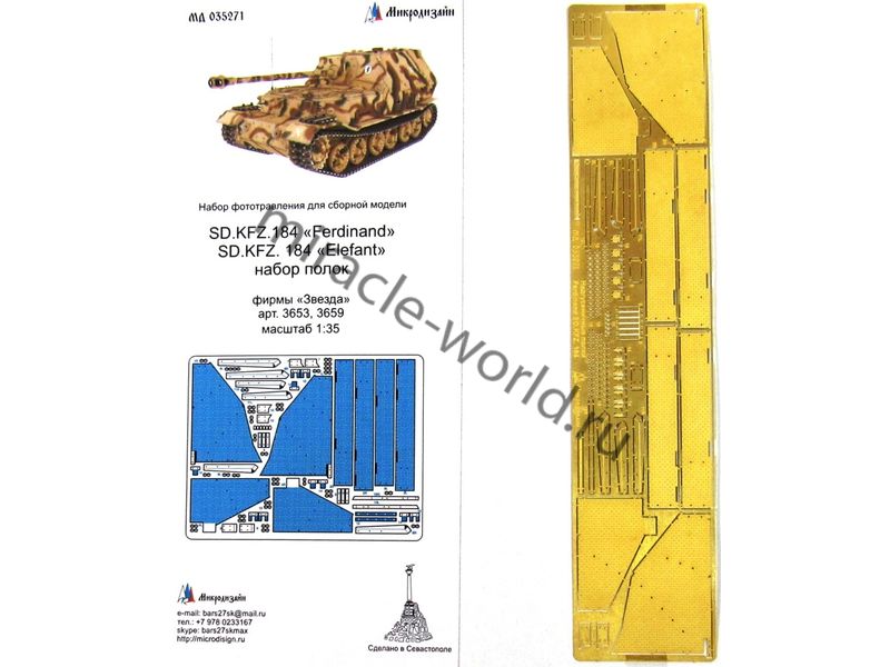 МД 035271 Набор фототравления надгусеничных полок для модели Ferdinand SD.KFZ 184 от Звезды (1:35). Набор комплектуется платой фототравления и цветной инструкцией. Количество уникальных деталей: 16 шт. Уровень сложности - средний.