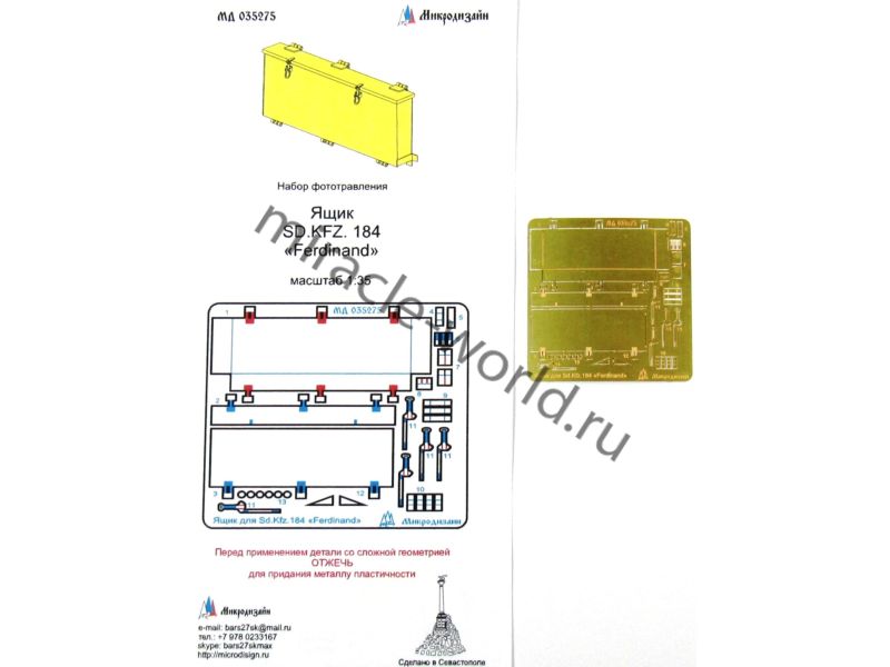 МД 035275 Набор фототравления инструментального ящика на модель SD.KFZ. Ferdinand от Звезды. Масштаб 1:35. Набор комплектуется платой фототравления и цветной инструкцией. Количество уникальных деталей: 13 шт. Уровень сложности - средний.
