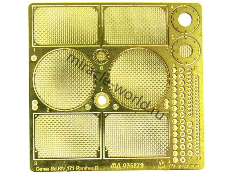 МД 035279 Набор фототравления сеток для PANTHER AUSF D. от Звезды. Масштаб 1:35. Набор комплектуется платой фототравления. Количество уникальных деталей 11 шт. Уровень сложности - начальный.