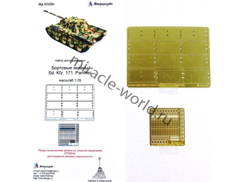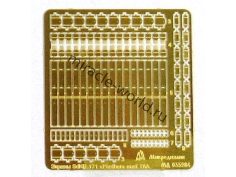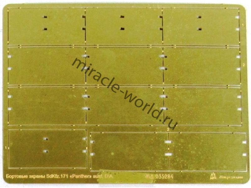 МД 035284 Набор фототравления бортовых экранов для SD.KFZ.171 Panther. Масштаб 1:35. Набор комплектуется 2 платами фототравления. Количество уникальных деталей: 9. Уровень сложности - средний.