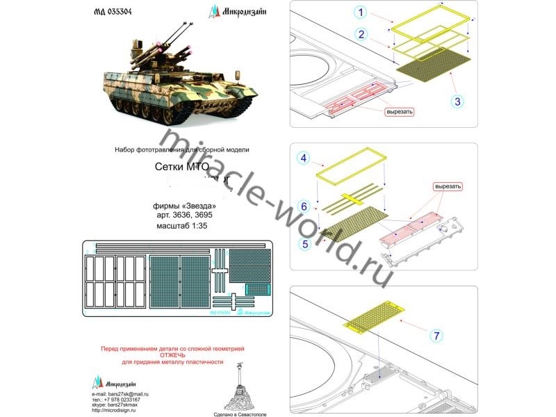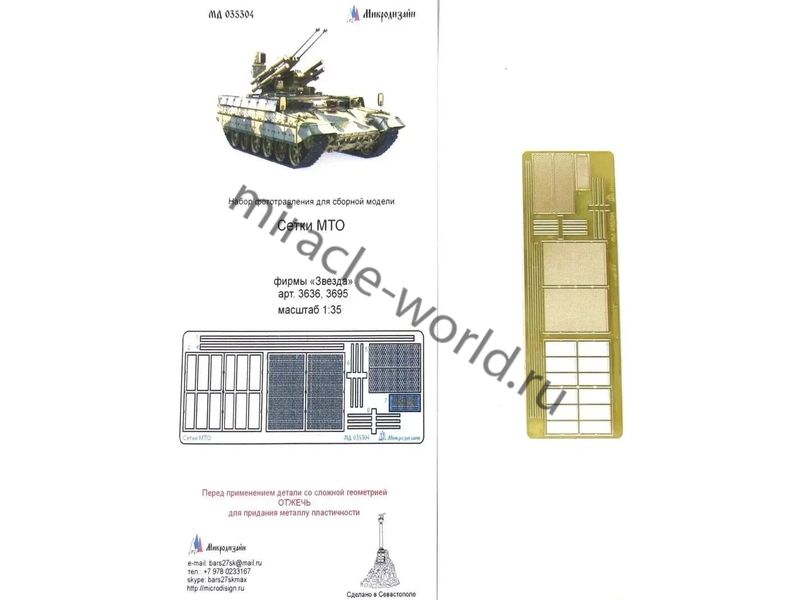 МД 035304 Набор сеток МТО для БМОПТ "Терминатор" и БМОПТ "Терминатор-2" от Звезды. Масштаб 1:35. Набор комплектуется платой фототравления и цветной инструкцией. Количество уникальных деталей: 7. Уровень сложности - начальный.