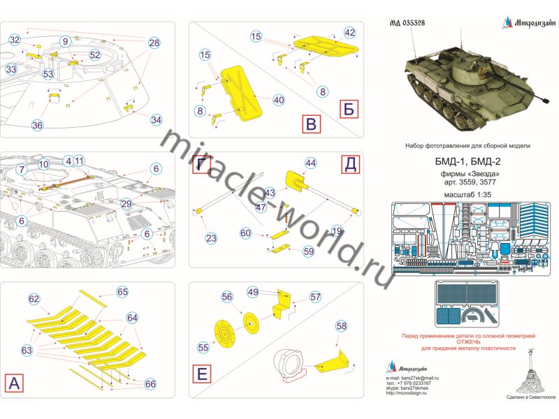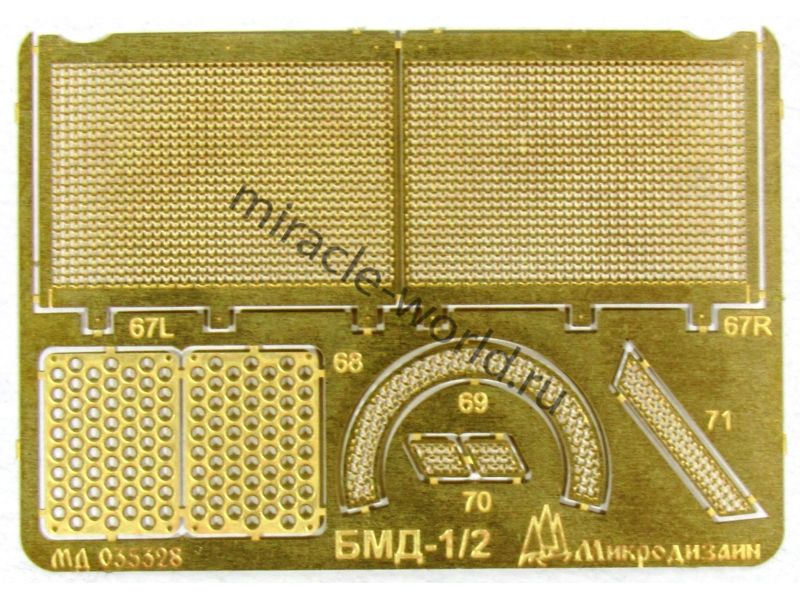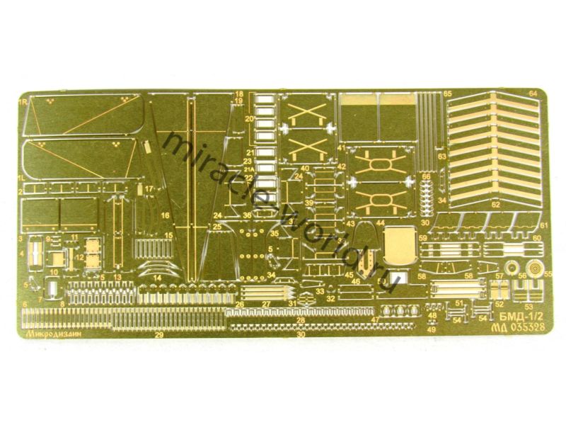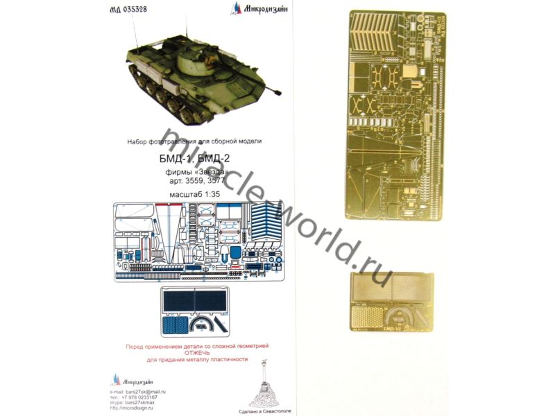 МД 035328 Набор фототравления на БМД-1/БМД-2 от Звезды. Масштаб 1:35. Материал: латунь 0,12 мм, 0,17 мм. Набор комплектуется 2 платами фототравления и цветной инструкцией. Количество уникальных деталей: 76. Уровень сложности - средний.