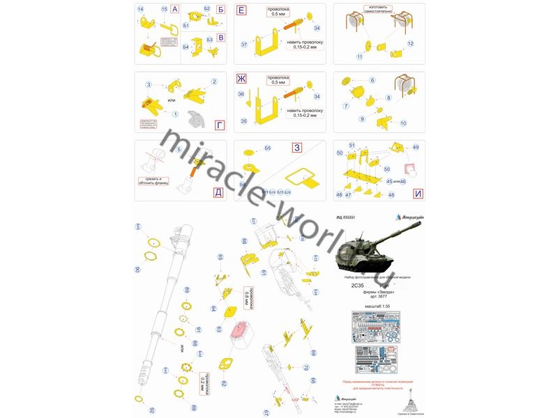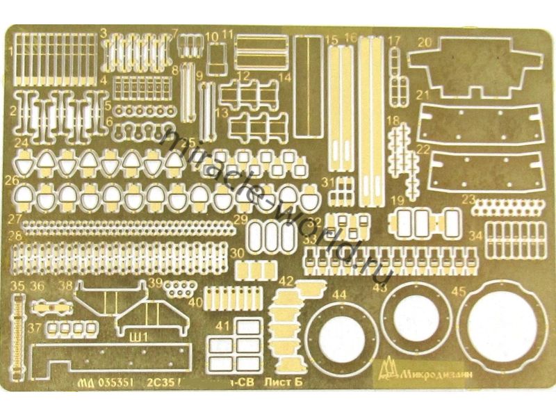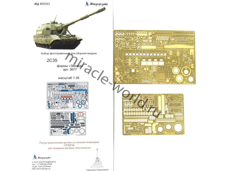МД 035351 Набор фототравления на 2С35 "Коалиция" от Звезды. Масштаб 1:35. Материал: латунь 0,17 мм и 0,12 мм. Набор комплектуется 2 платами фототравления. Количество уникальных деталей: 86. Уровень сложности - средний.
