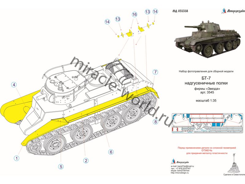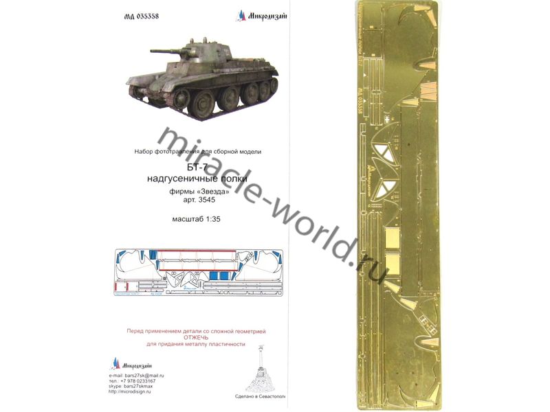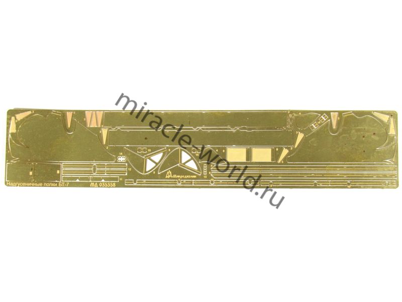 МД 035358 Набор фототравления надгусеничных полок для БТ-7 от Звезды. Масштаб 1:35. Материал: латунь 0,17 мм. Набор комплектуется платой фототравления. Количество уникальных деталей: 15. Уровень сложности - средний.
