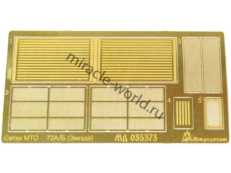 МД 035373 Набор фототравления Т-72А/Б (сетки МТО) от Звезды. Масштаб 1:35. Набор комплектуется платой фототравления. Количество уникальных деталей: 5 шт. Уровень сложности - начальный.