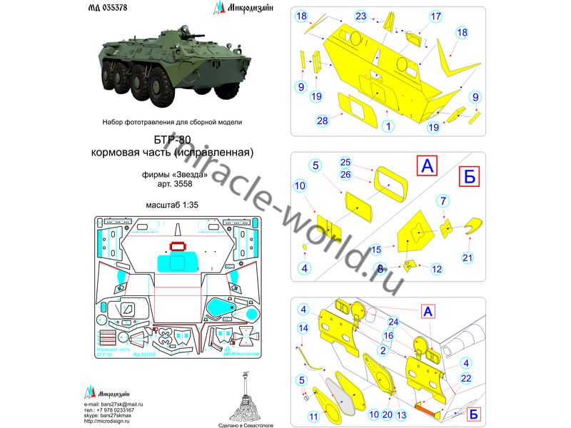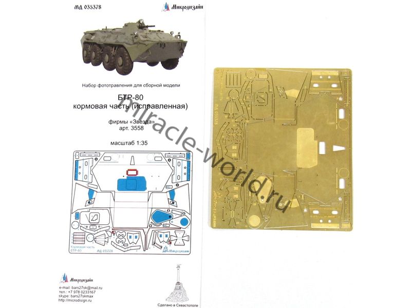 МД 035378 Набор корректировочного фототравления на корму БТР-80 от Звезды. Масштаб 1:35. Материал: латунь 0,17 мм. Набор комплектуется платой фототравления. Количество уникальных деталей: 42. Уровень сложности - средний.