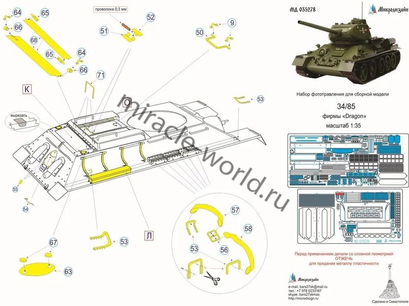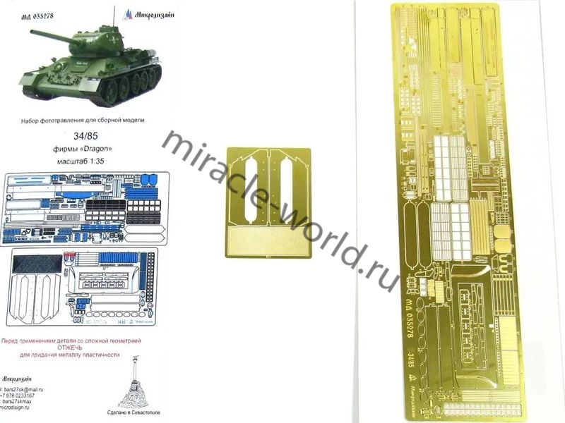 МД 035278 Набор фототравления для Т-34/85 от Dragon. Масштаб 1:35. Набор комплектуется 2 платами фототравления. Количество уникальных деталей 135 шт. Уровень сложности - средний.