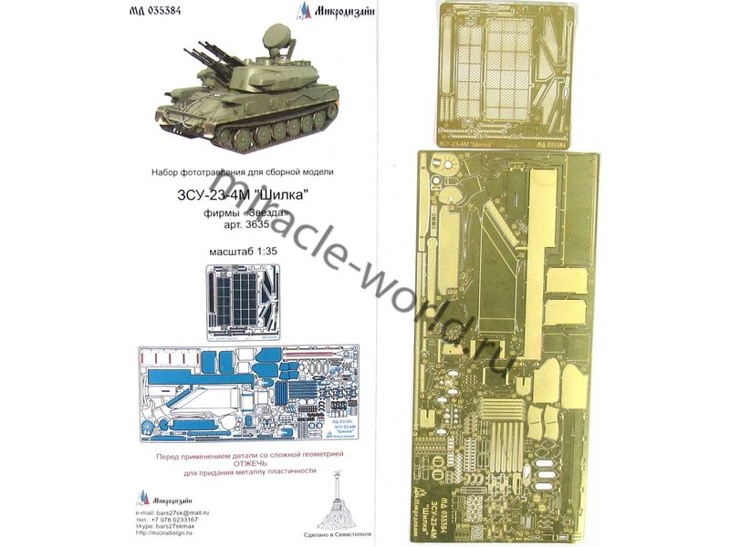 МД 035384 Набор фототравления на ЗСУ-23-4М "Шилка" от Звезды. Масштаб 1:35. Материал: латунь 0,17 мм и 0,15 мм. Набор комплектуется 2 платами фототравления. Количество уникальных деталей: 92. Уровень сложности - высокий.