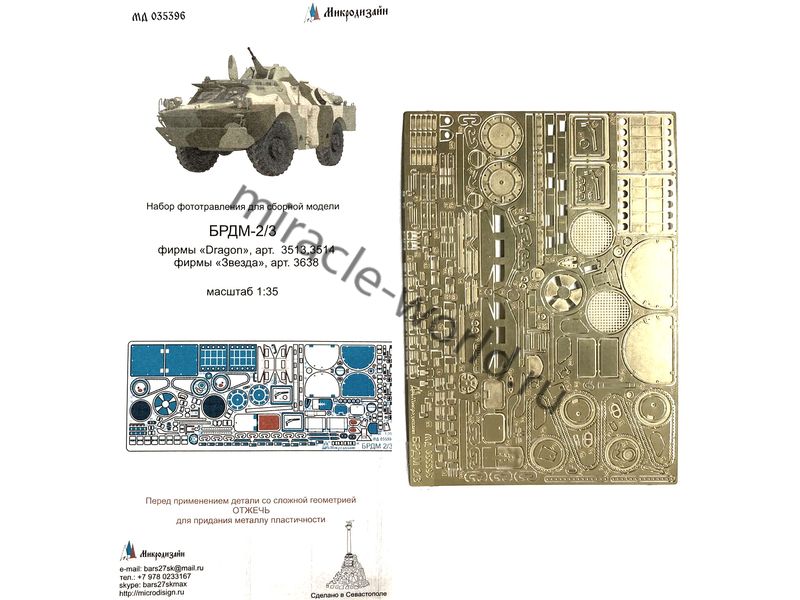 МД 035396 Набор фототравления на БРДМ-2 от Звезды и БРДМ-2/3 от Dragon. Масштаб 1:35. Материал: латунь 0,17 мм. Набор комплектуется платой фототравления и полноцветной инструкцией. Количество уникальных деталей: 85. Уровень сложности - средний.